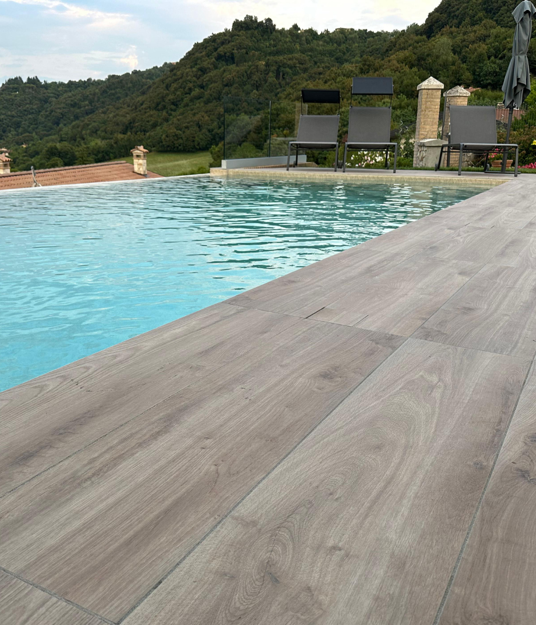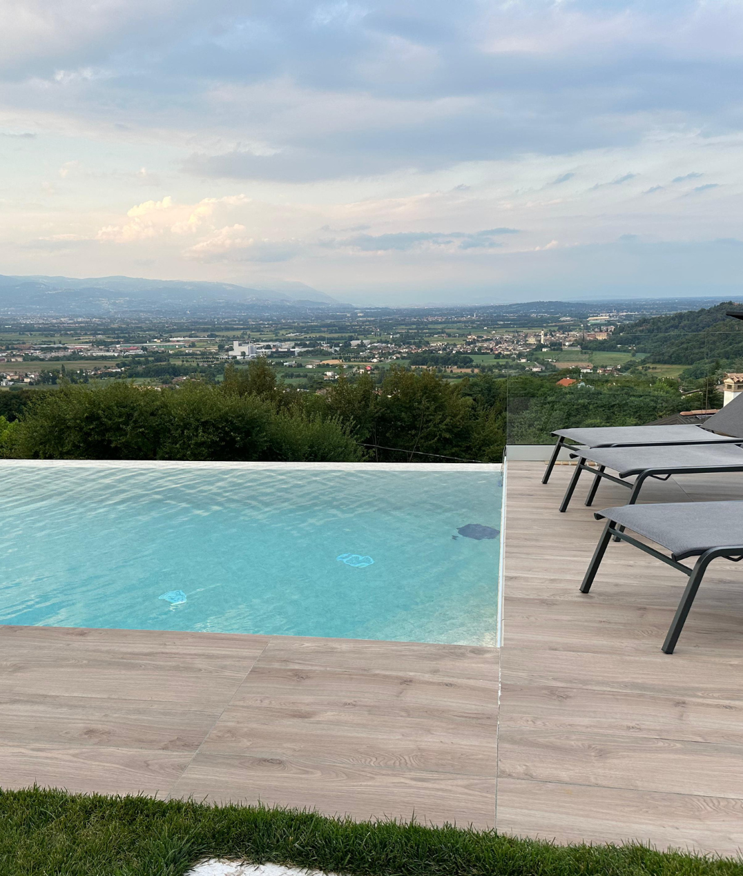 La pavimentazione del bordo piscina è stata realizzata con una finitura resistente e antiscivolo, ideale per garantire sicurezza e durabilità nel tempo, senza rinunciare all’eleganza. La continuità materica contribuisce a definire un ambiente armonioso, in dialogo con il paesaggio circostante.